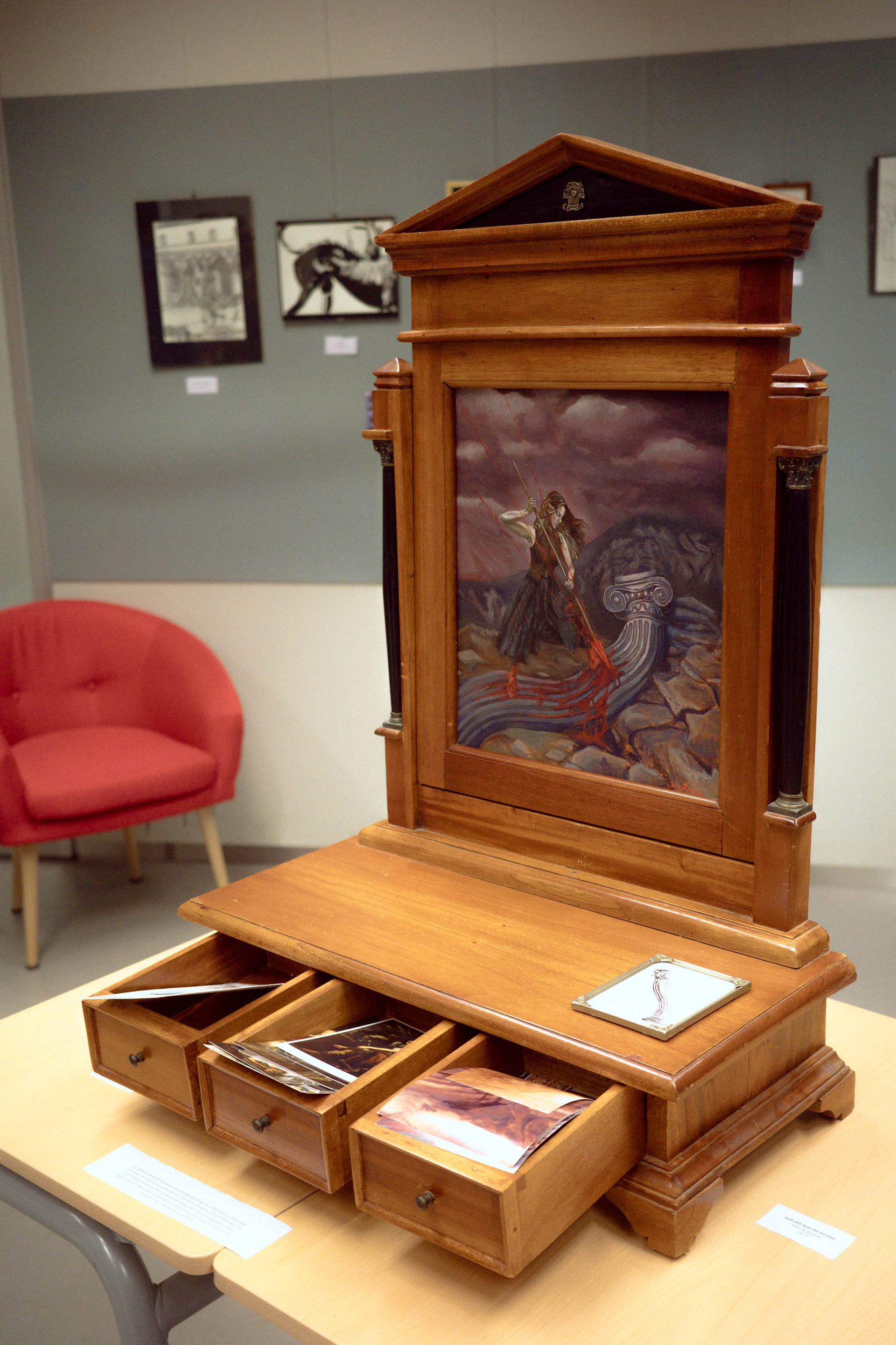 In this portrait I kill the classics. At least, in a most aggressive gesture, I try to. I worked with a classical layering technique, building op from brown, to grey shades to colour glazing. The painting is enlisted within a 19th century dresstable, shaped like a classical temple.